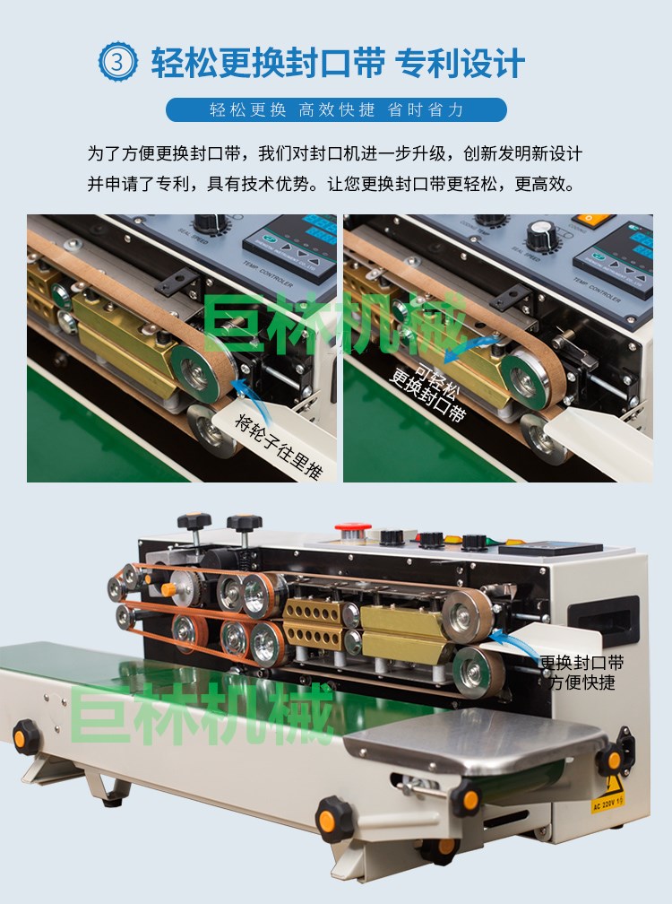 該機具有連續(xù)輸送、封口、油墨印制標簽(出廠日期、生產(chǎn)批號等)一次完成之功效,可封合印制任何一種可熱性的薄膜。