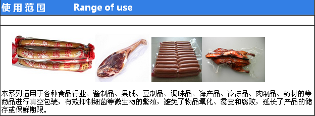 該機(jī)適 用如:肉類加工、醬腌產(chǎn)品、水產(chǎn)、海產(chǎn)品加工、蔬菜加工、農(nóng)副產(chǎn)品加工、果脯、糧食、豆制品、藥材、電器、化學(xué)制品等顆粒、粉狀、液體等食品進(jìn)行真空后充惰性氣體包裝、可以防止產(chǎn)品氧化霉變、腐敗、防潮達(dá)到延長(zhǎng)產(chǎn)品的儲(chǔ)存期限。