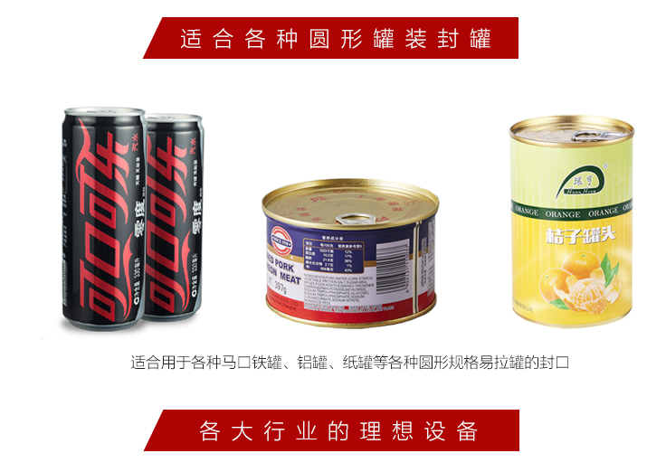 4、適用于各種馬口鐵罐、鋁合金罐、紙罐等各種圓形規(guī)格易拉罐的封口,操作簡單易學,是食品、飲料、制藥等行業(yè)的理想設(shè)備
